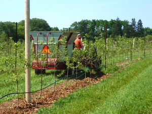 Spreading Mulch with an automated side-delivery mulch wagon |